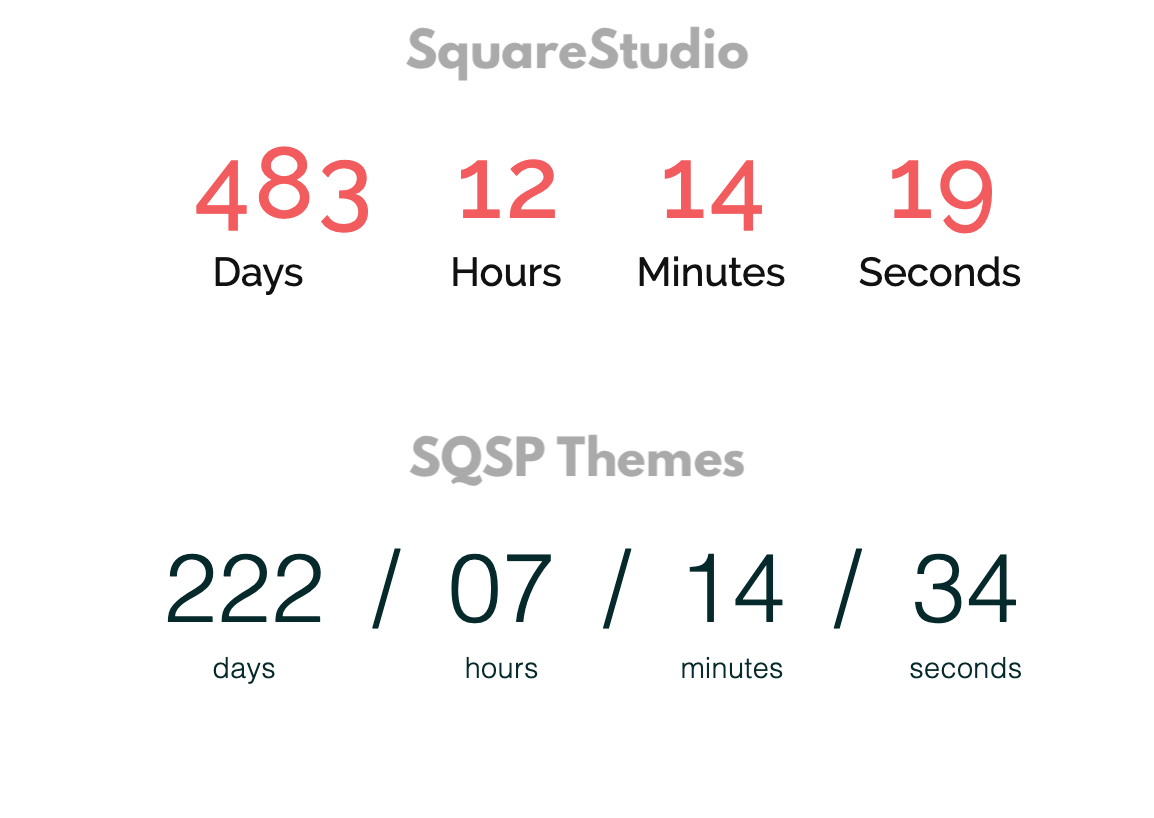 You have two options for the best countdown clock plugin for Squarespace. Option one is $20 from SQSP Themes and option two is $19 from SquareStudio