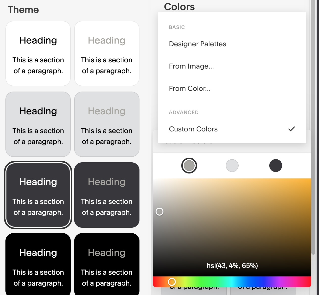 The first time we used it, we found the new Color palettes a bit confusing. The first time you add a section and try to change the colors, it looks like you can only choose from a few different shades of gray. This isn’t true (thank god).
