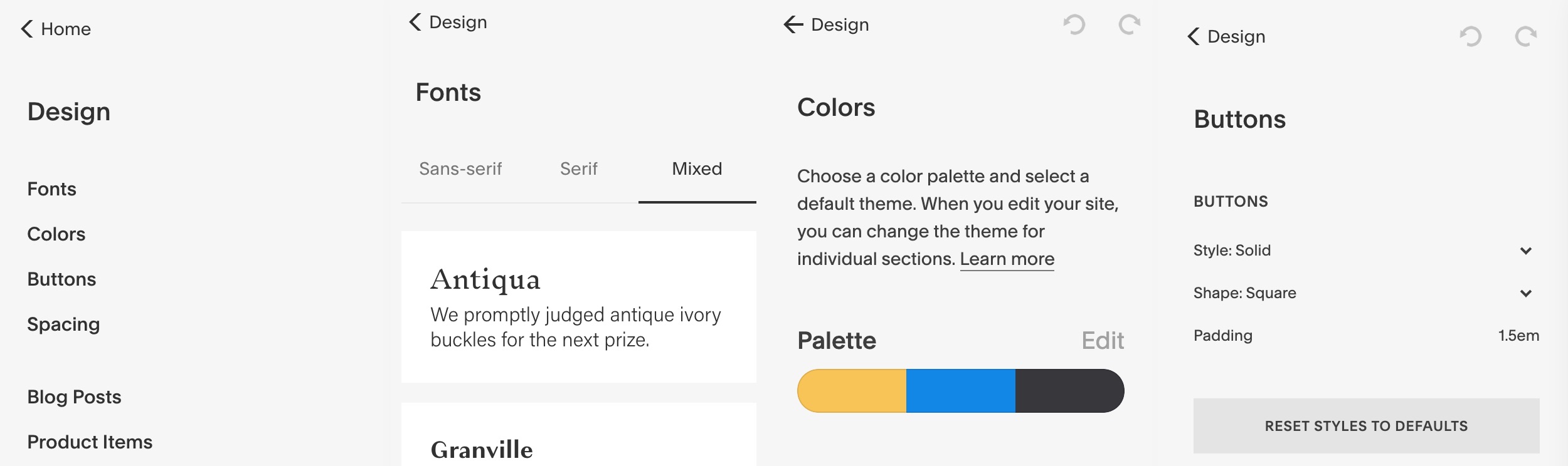 The ‘Design’ section in your Squarespace dashboard got a big refresh in the Squarespace 7.1 update. It’s easier to customize typography, change your color palette, make site-wide tweaks to buttons, and you can customize ‘Collection items’ right from the Design section.