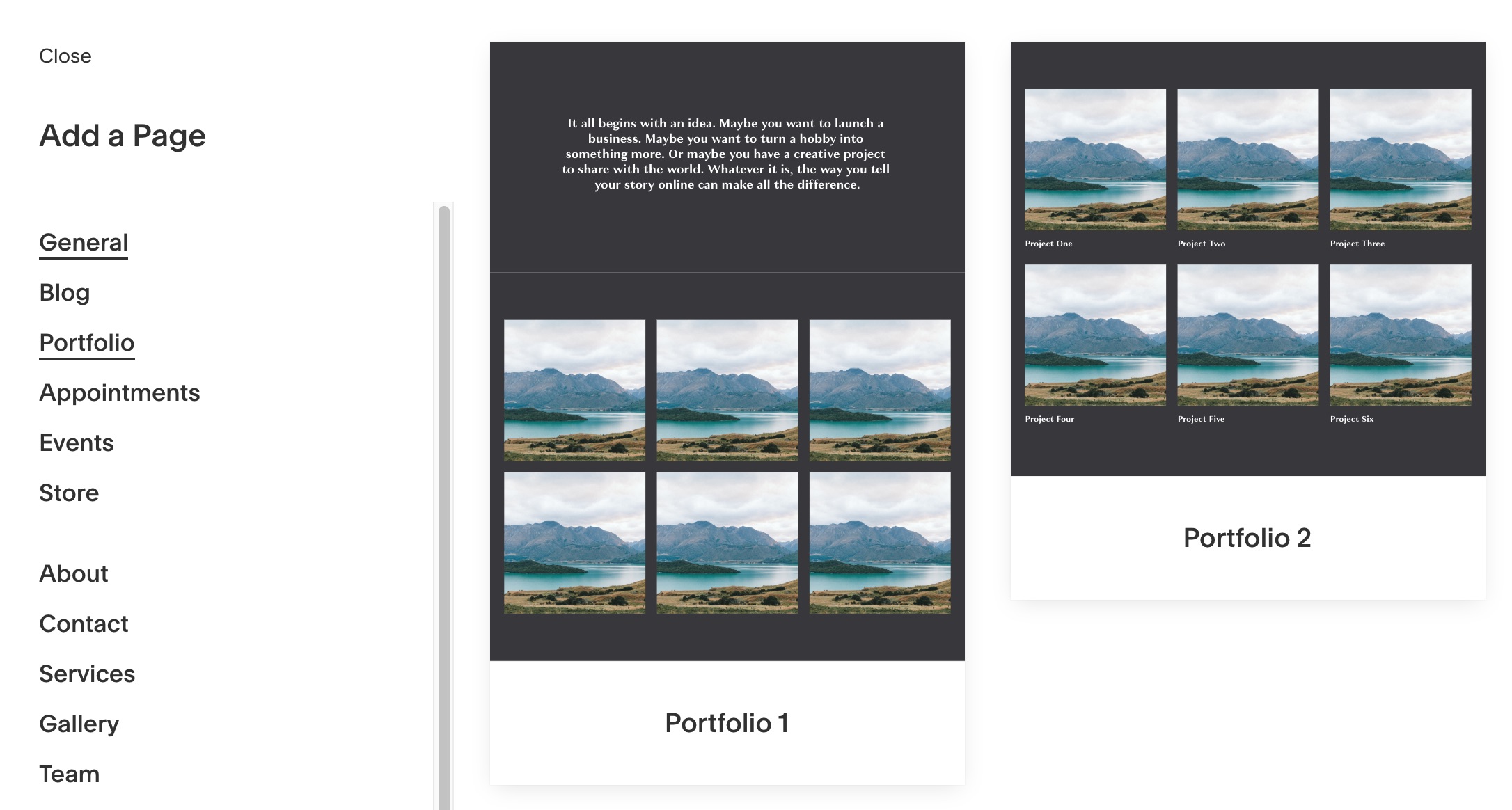 In the (updated in 7.1 with a really nice refresh) Page creator, choose ‘Portfolio’. You’ll get a bunch of options for different layouts. Then, under that page, Squarespace will create sub-pages for each project in your portfolio, which you can customize with new Sections, images, and text.