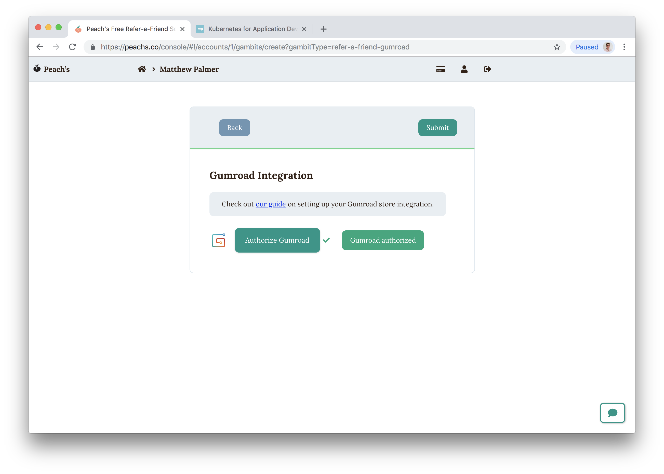Back in the Peach’s console, complete the next step by authorizing Peach’s with your Gumroad account.