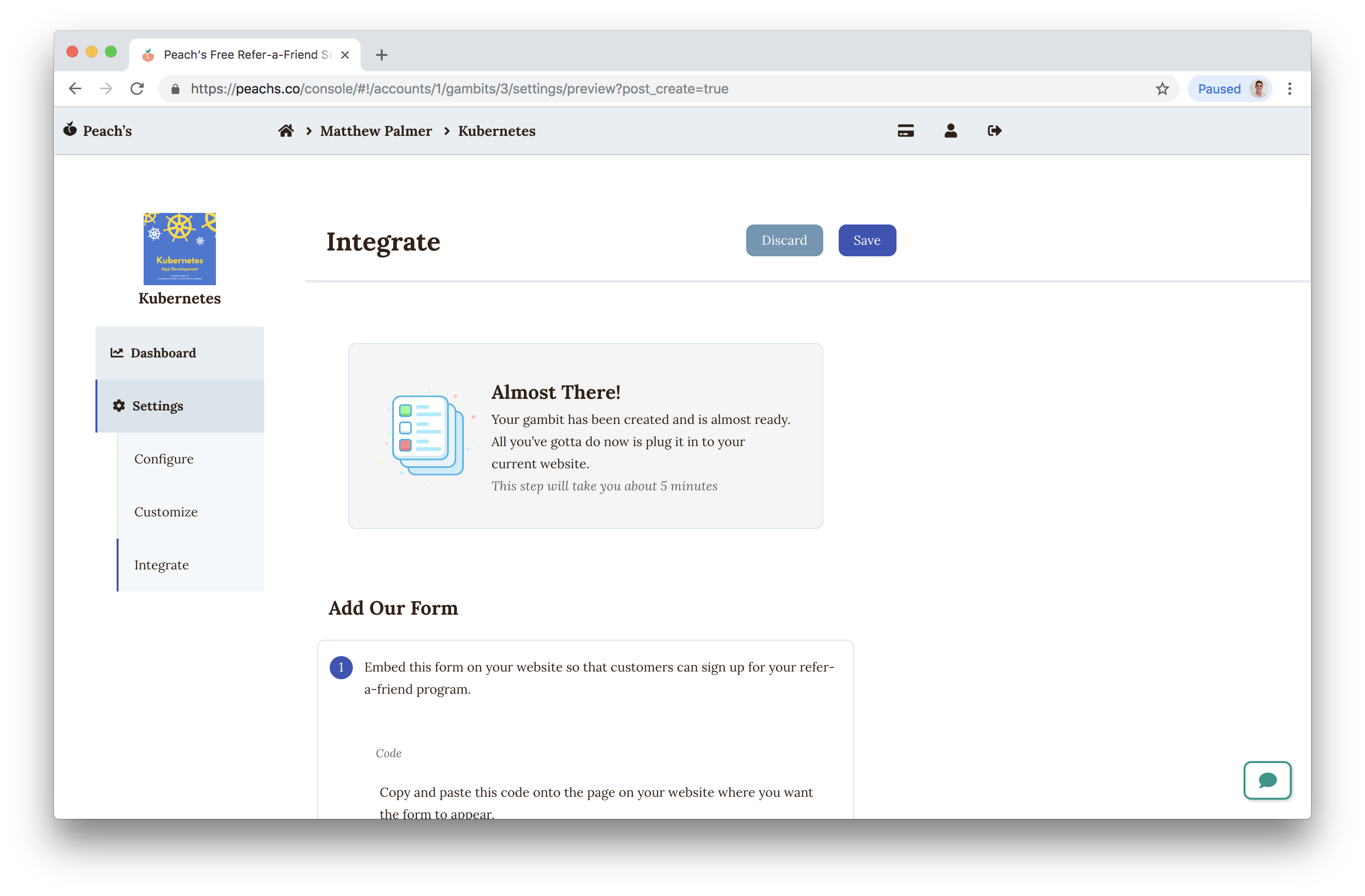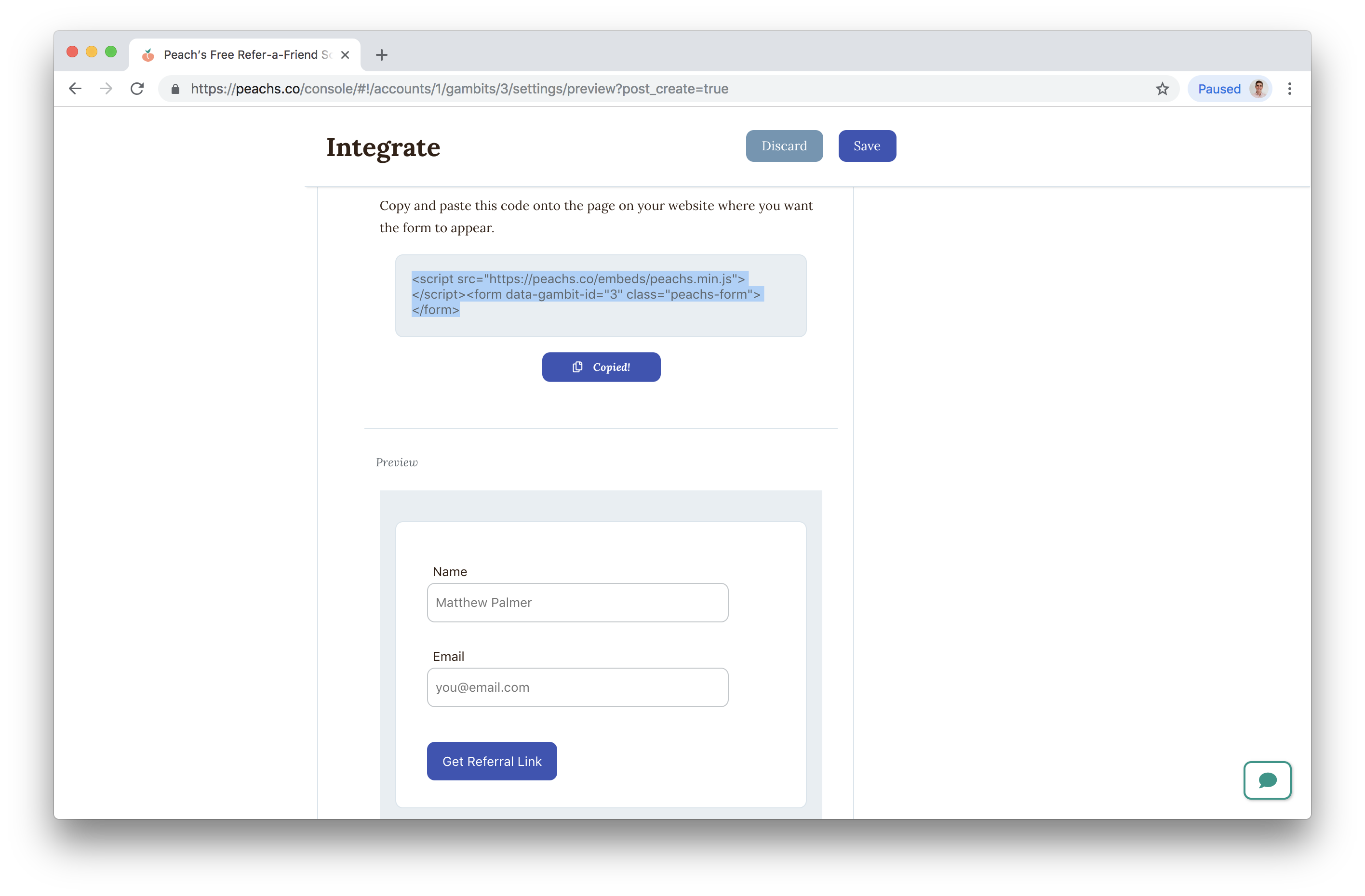 Almost there! The last step is to embed the Peach’s form onto your website where you want to let people sign up for your refer-a-friend program. Simply copy and paste our script into your website’s HTML.