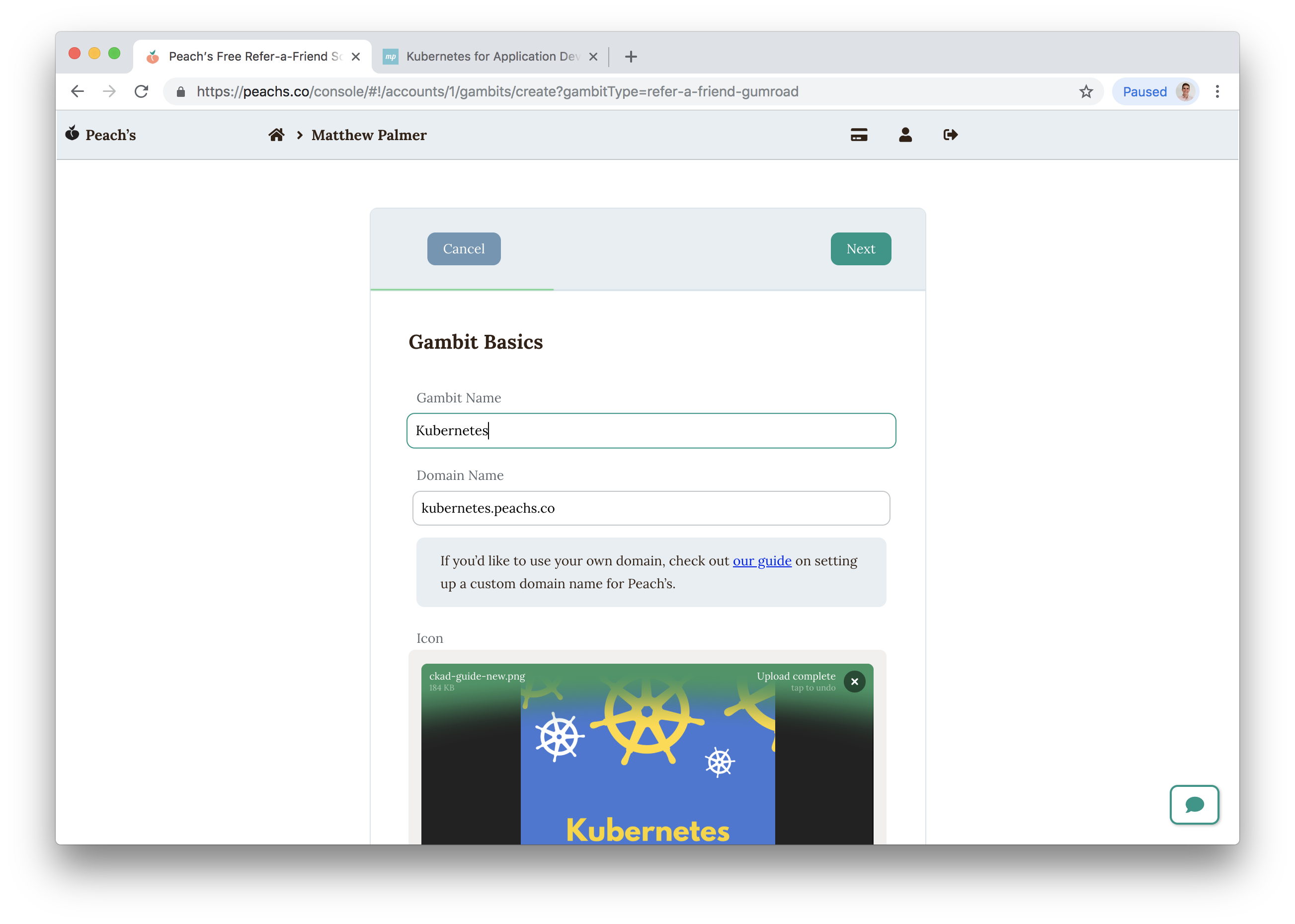 Enter the name, domain name, and icon you want to use for your gambit. If you do not wish to use a custom domain name, Peach’s will automatically generate a domain name that you can use. This domain name will be used in links your customers shared. In this example, customers would share links that look like kubernetes.peachs.co/r/grand-elephant.