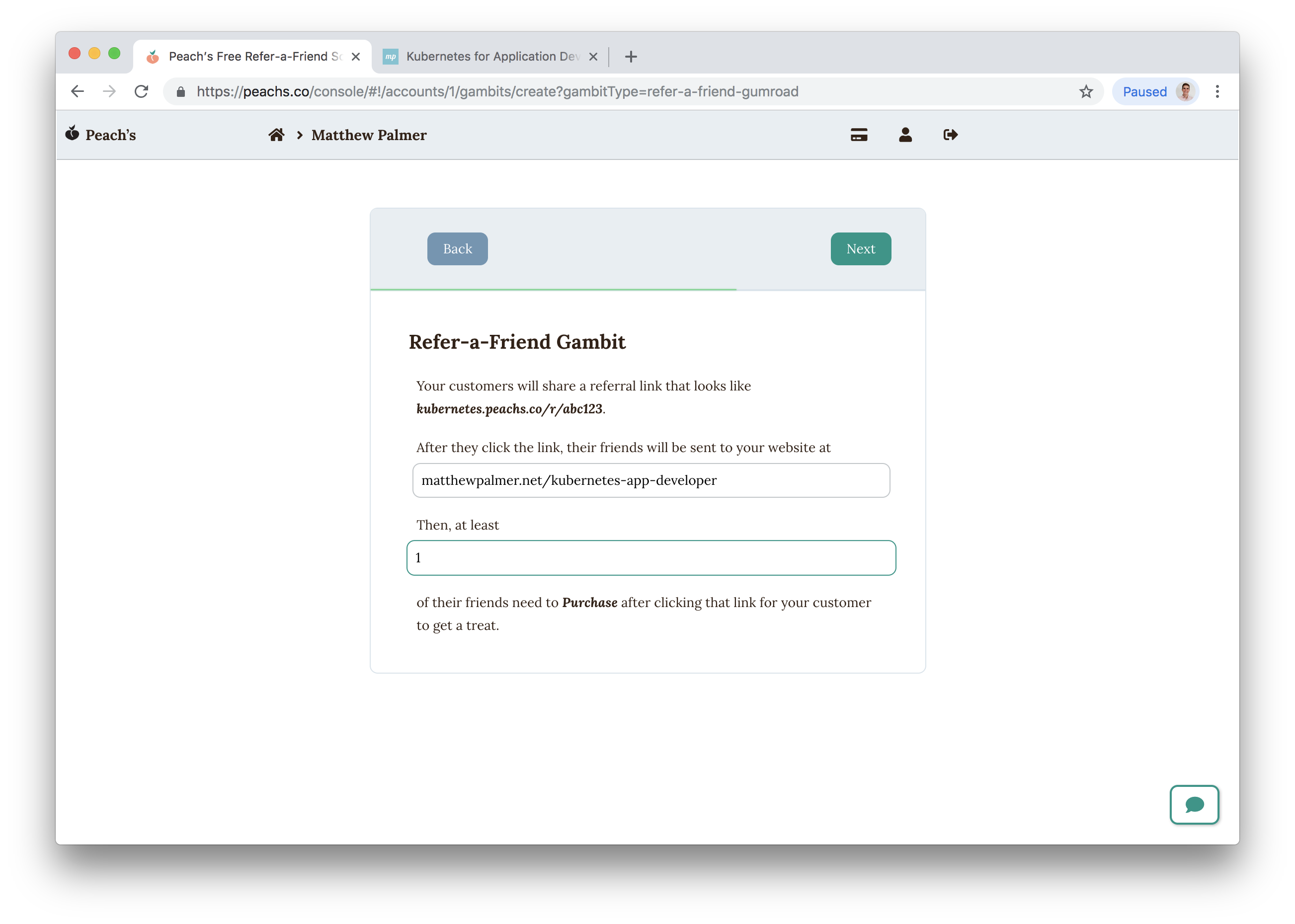 Enter your page’s URL and the number of people who need to purchase your product. This page URL should be the page where you have embedded your Gumroad button. In our example, after people click a shared link like kubernetes.peachs.co/r/grand-elephant, we want to take them to matthewpalmer.net/kubernetes-app-developer where they can purchase the ebook.