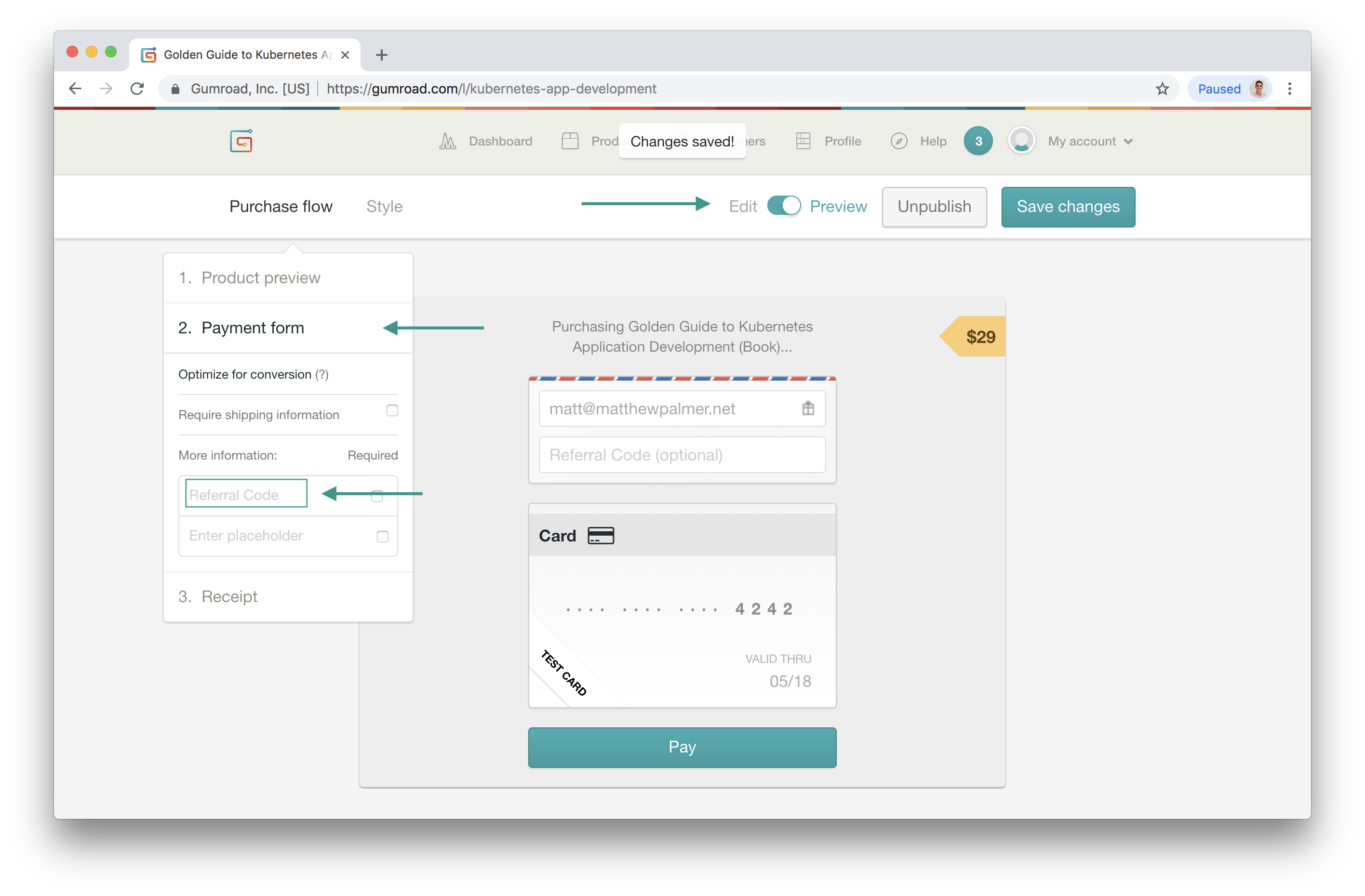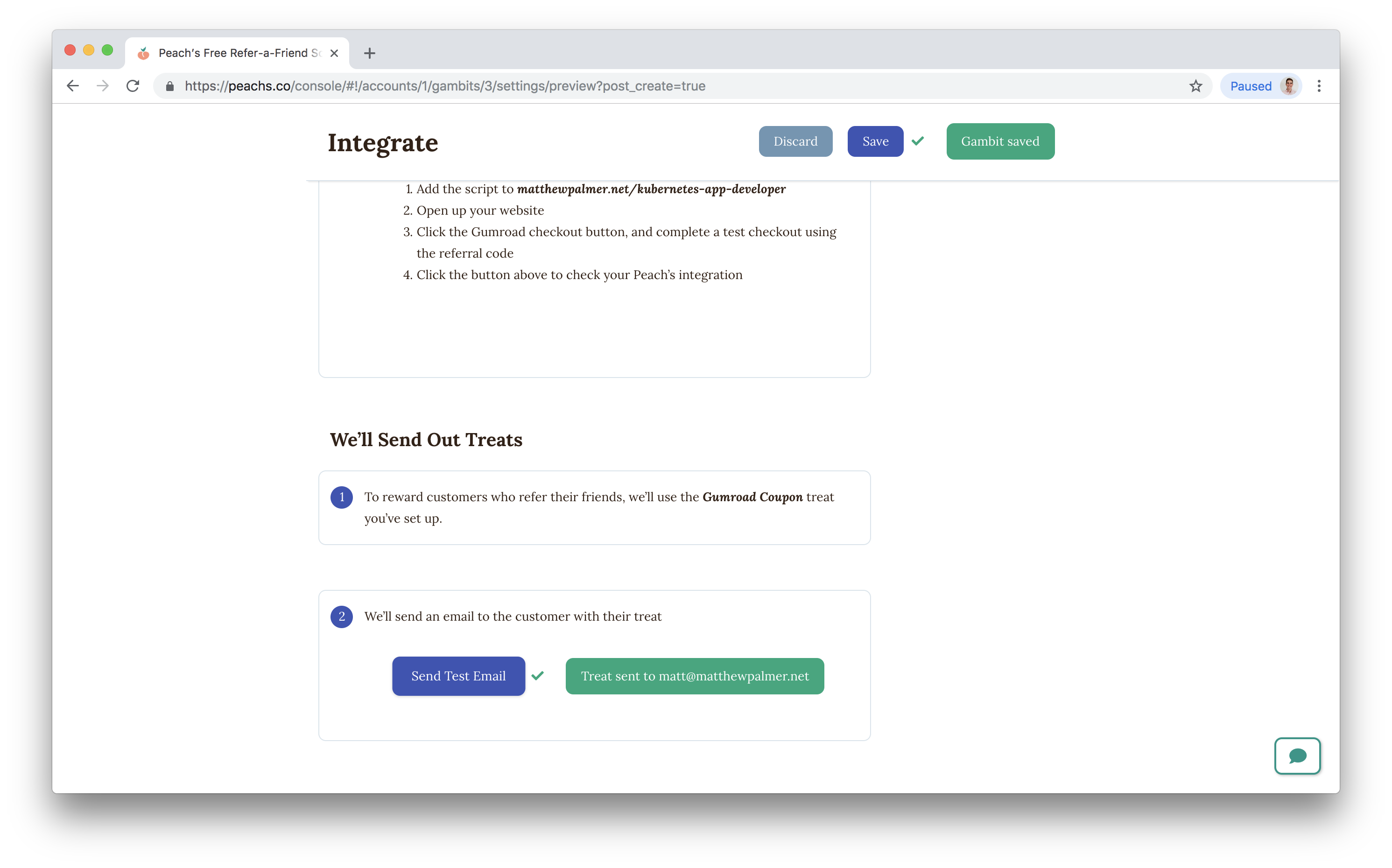 Check that our Gumroad refer-a-friend gambit is configured correctly by clicking ‘Send Test Email.’ You should receive an email that takes you to your Gumroad store with the discount coupon applied.