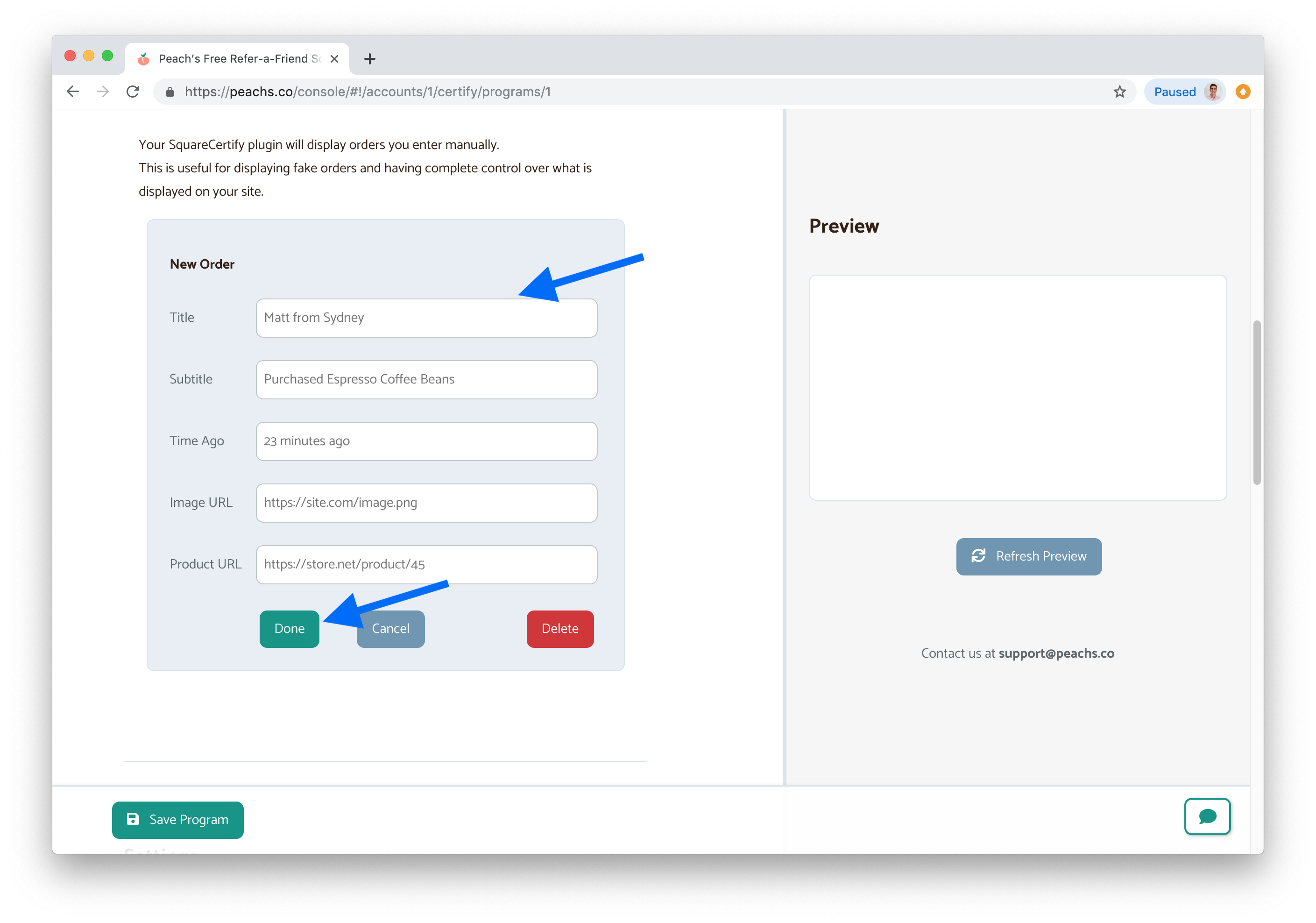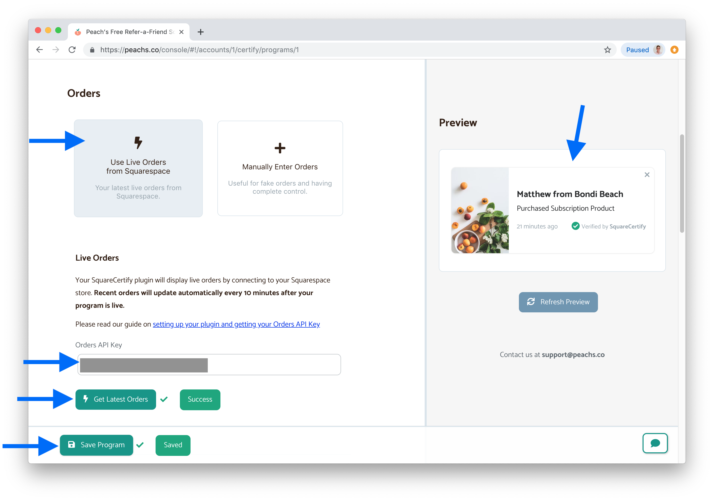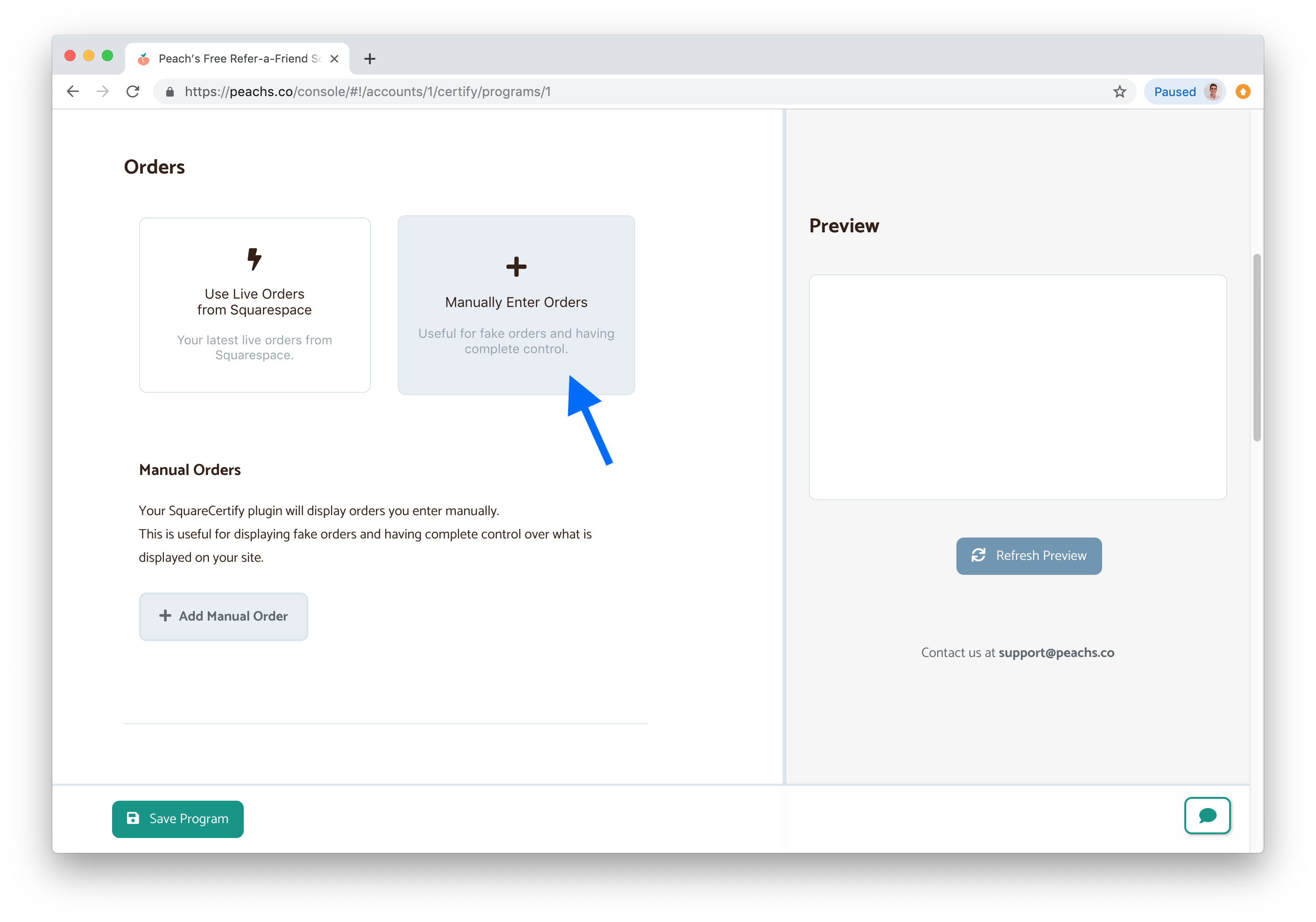 With SquareCertify, you can set the plugin to use live sales from your Squarespace store, or pre-populated orders that you define. (This can be useful for entering fake orders or if you want to highlight particular products.)