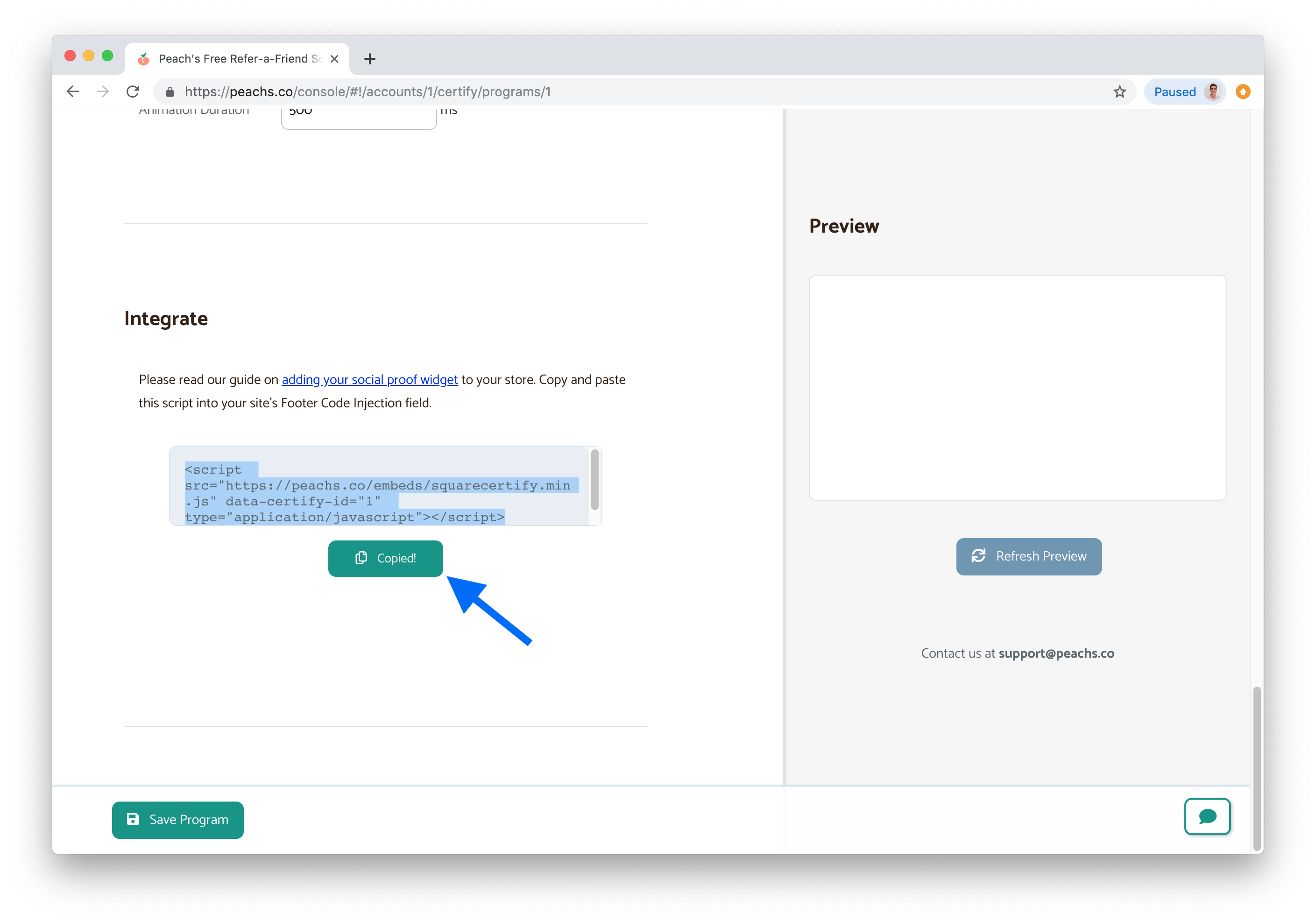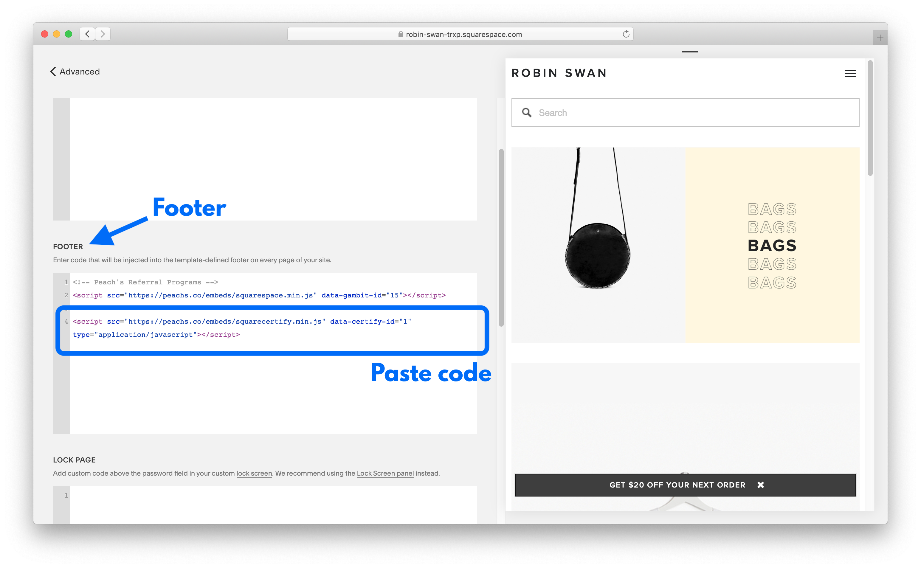 The last step is to copy your SquareCertify plugin’s code into your Squarespace site.