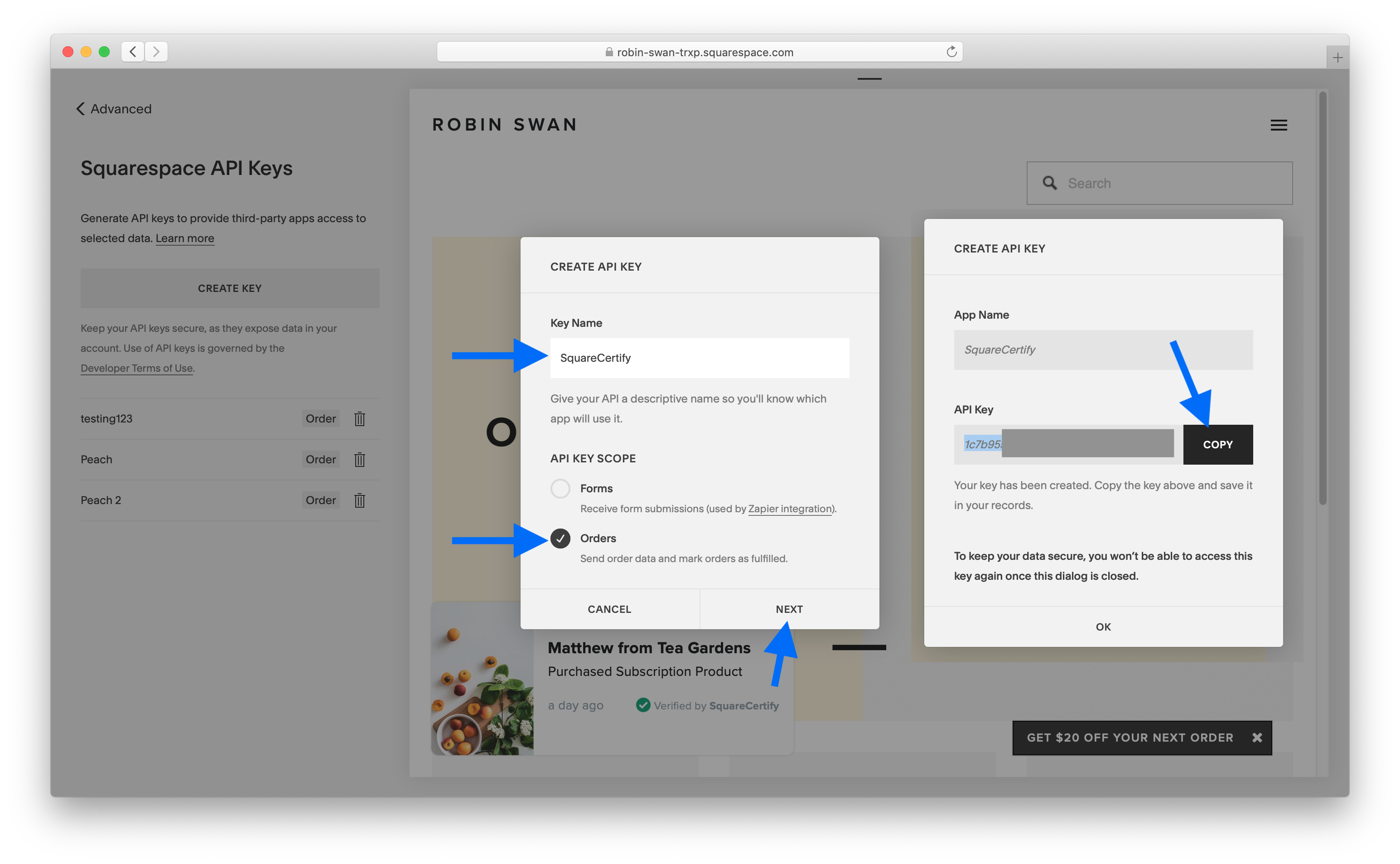 Click Create Key, and enter SquareCertify for the key name. For the API Key Scope, select Orders.