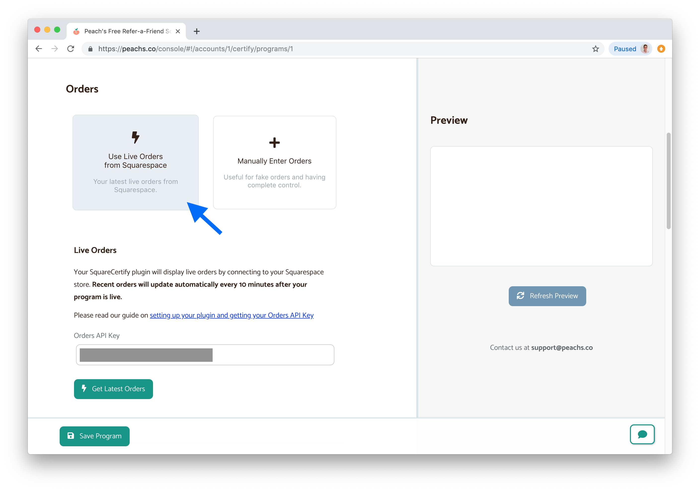 Then, back in your SquareCertify settings, paste in your API Key, and click Get Latest Orders to test it out. Then click Save to save your settings.