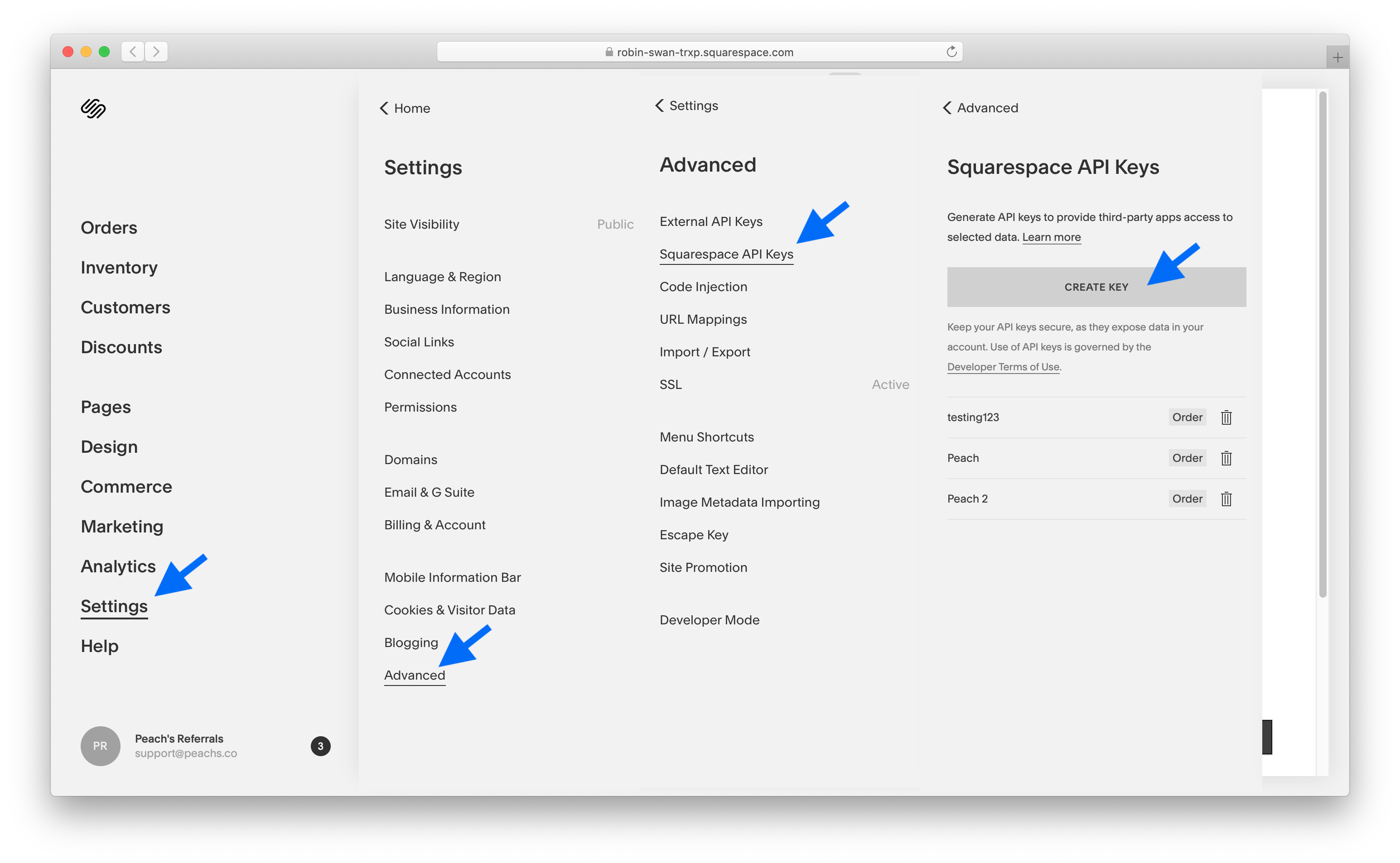 Then, in the sidebar, navigate to Settings > Advanced > Squarespace API Keys, as shown in the screenshot below.